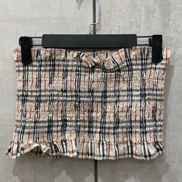 Smocked tube top featuring a timeless burberry-inspired plaid print in beige, black, white, and soft red tones. Fully elasticized smocking throughout allows for a flexible, comfortable fit that hugs the body. Finished with a ruffled lettuce edge at both the top and bottom for a feminine, Y2K-inspired look. Can be worn strapless or styled layered under a jacket or cardigan.