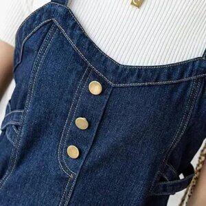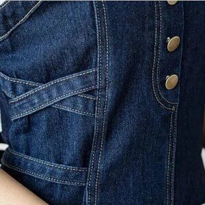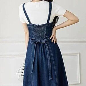 Smocked Button Decor Dark Wash Denim Tie-Up Midi-Maxi Dress