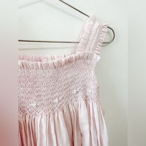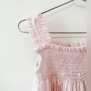 Vintage blush dress with smocked bodice, ruffle top and embroidered detailed straps. Layered skirt in soft light cotton fabric. Covered buttons on back.