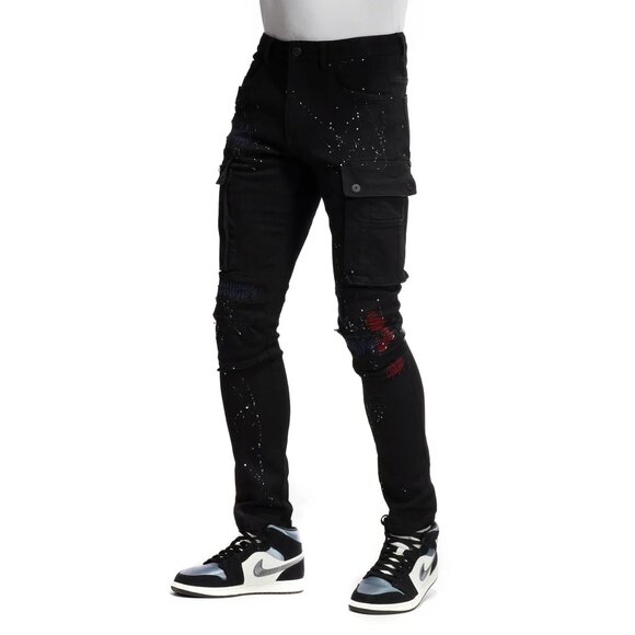 Smoke Rise Denim Company slim tapered rip & repair black denim cargo pants. Fit: Slim Tapered.Multi Cargo Utility, lots of pockets. Custom white paint splatter. Zig Zag Stitch Details in red, blue, and black. Every one is unique! In EUC, almost like new except one little smudge that may or may not be part of the design, see photo. Size 38 waist, 32 inseam.