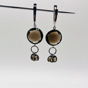 Silver tone smokey quartz large dangle earrings