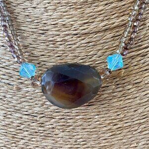 The 28mm faceted smokey quartz focal is highlighted with fine Austrian crystal and is hanging from a double-stranded necklace made of fine bronze washed faceted Czech beads.