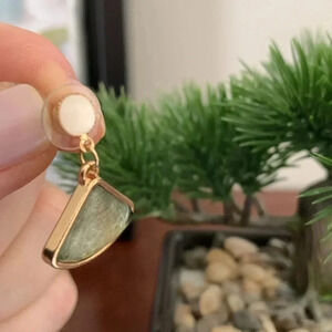 Pretty color of smoky green goldtone triangle drop earrings. Pearly-white bead stud. Simulated stones/beads. Fashion jewellery. See photos for details.