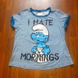 Bring some classic cartoon attitude to your wardrobe with this officially licensed 2012 Smurfs graphic tee! Features Grouchy Smurf and the bold phrase “I Hate Mornings” on a blue and white striped background. Soft and comfy, with teal trim on the collar and sleeves.