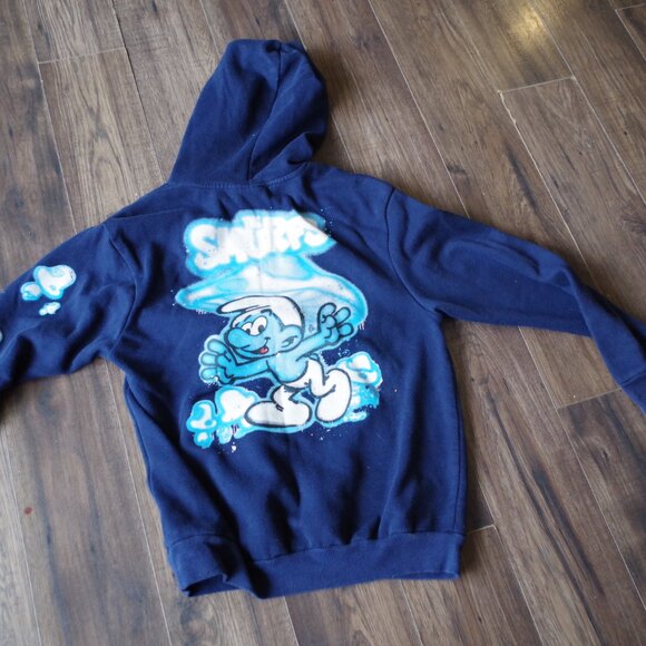 Smurfs navy blue sweat shirt, made in Pakistan ,from 2022,by Lic. Lafig Belgium .In good condition ,pit to pit 211/2 inches across, size large ,women's large, picture Smurfs with a mushroom.