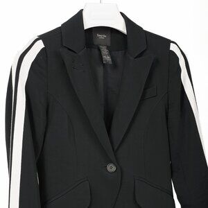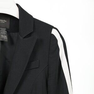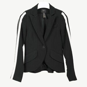 Made in Canada, this blazer from Smythe is crafted with a black wool blend crepe, and is adorned with white grosgrain stripes on the sleeves. It features long sleeves, faux buttoned cuffs, lightly-padded shoulders, a peak lapel collar, a single button closure, a tuxedo chest pocket, front flap pockets, a double vented back, and is lined in a tonal satin.