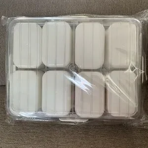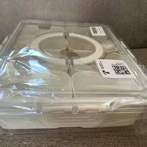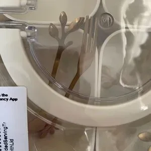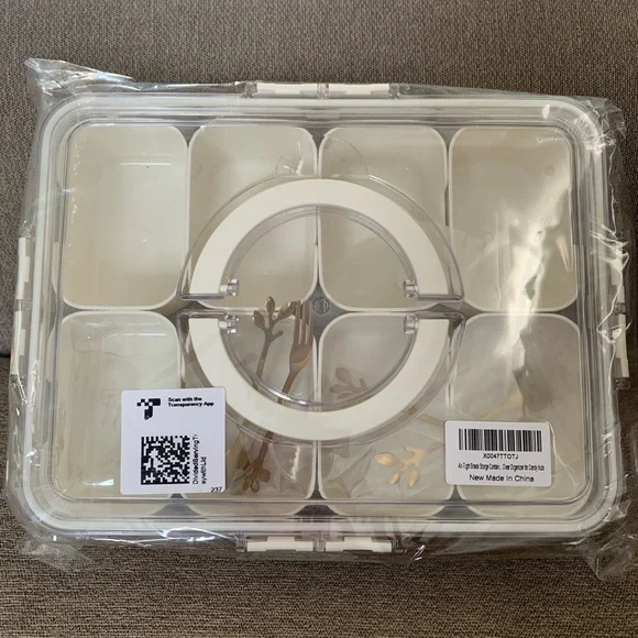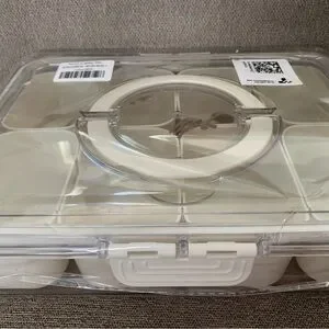Clear snackle box with white compartments. Great for snacks or organizing small items. Airtight, snap-on lid. Carrying handles. Also come with decorative mini serving forks and spoons (2 of each). Great for party prep or picnics! Individual dishes come out for washing and drying.