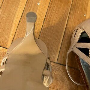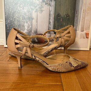 Description: golden shimmer faux snake print pumps with adjustable strap.