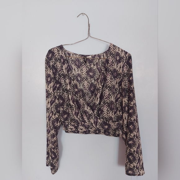 Stylish snake print crop blouse with long sleeves. Features a mix of black grey and purple colors .