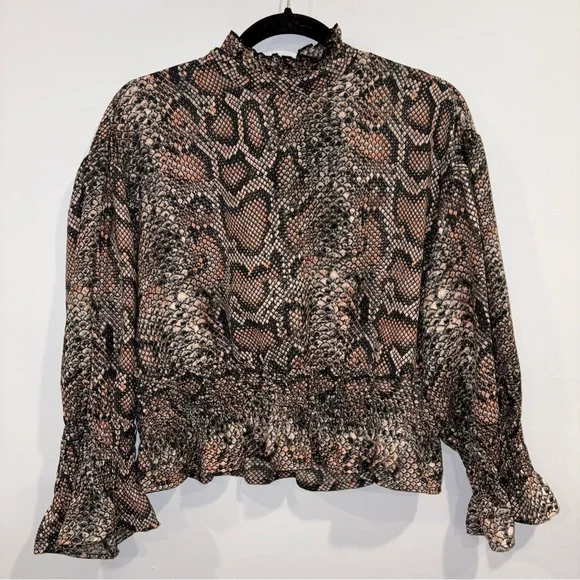 Elevate your style with this chic snake print blouse. Featuring a ruffled neckline and cuffs, it's perfect for any occasion.