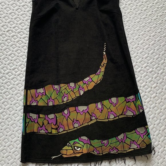 Foil Printing with a cute colourful snake. Frayed detailing along the hem, neck, and cuffs.