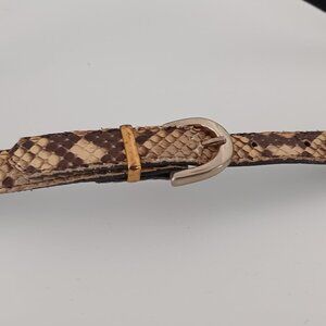 Snake print leather belt. Side details in golden metal. About 34" long.