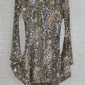 This is a very very unique piece from LA fashion. transparent sequins over snake skin pattern stretchy top. Easy to wear. The sleeves are connected to the body of the top and it is definitely a conversation piece. You can wear it alone as a mini or put on a pair of tights and wear it with heels!