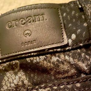 Black stretch jeans with embossed snakeskin pattern feature jean styled pockets, belt loops, button & zip fly. ‘Coco fit’ for those familiar with this brand, a European design house.