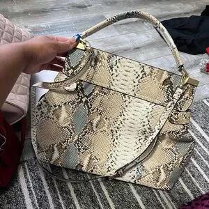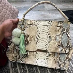 Elevate your style with this chic snakeskin pattern handbag. Featuring a blend of cream and tan colors, this bag is perfect for any occasion.