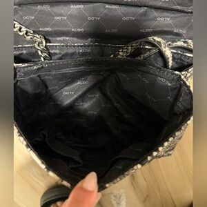 Elevate your style with this chic snakeskin patterned shoulder bag. Featuring a sleek black and gray design, this bag is perfect for any occasion. The chain strap adds a touch of elegance. Some wear on the front clasp.