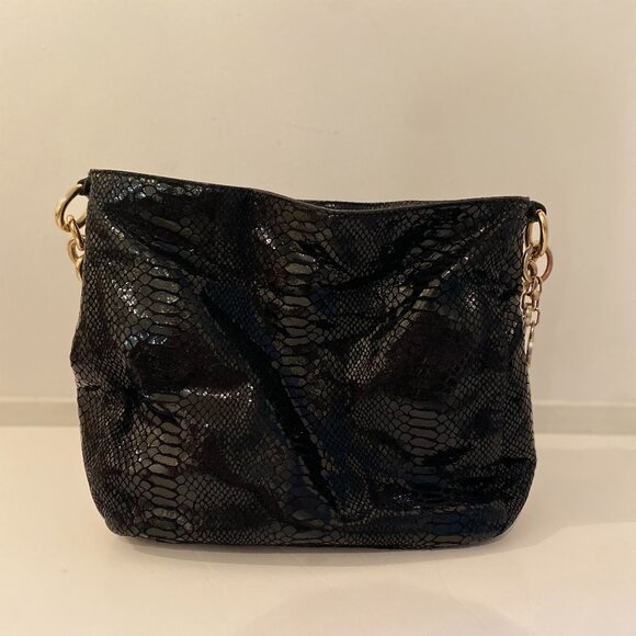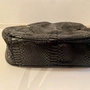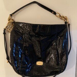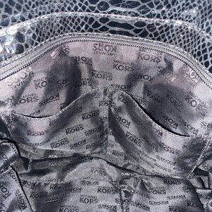 The bag is medium sized in sized (W. 14.5", H. 12" and D. 3") The front of the purse has two zipper compartments which can be used for your keys. The inside of the purse/bag is lined with black material and features an inner zipper compartment, plus four small inner pockets for cell phone, card holders etc. The strap is adjustable and can be worn as a cross-body bag. This Michael Kors Python bag is a must-have for any fashion-forward woman. It is perfect for any occasion, whether for travel, events or business and in perfect condition. No flaws, to tears, no rips, no stains.