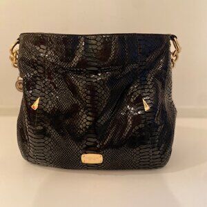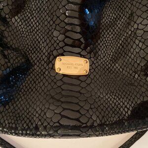 Pre-owned stylish and classy Michael Kors snakeskin embossed purse. This luxury item features a square shape with a snakeskin texture. It is made of high-quality leather and has an additional cross body strap and leather handle with for easy carrying. Slight scratch on the gold logo, Michael Kors on the front of the bag - barely noticeable.