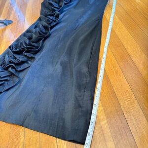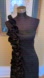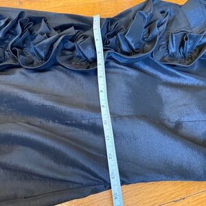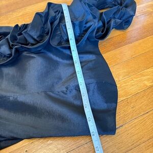 Chic one-shoulder dress with ruffle detail. Perfect for evening wear. Marked size large and shown fitting loosely on a size 6 mannequin whose measurements are bust 34” waist 28”. I would call this a juniors large and a ladies medium. The fabric does have a good amount of stretch in it. Side zipper.