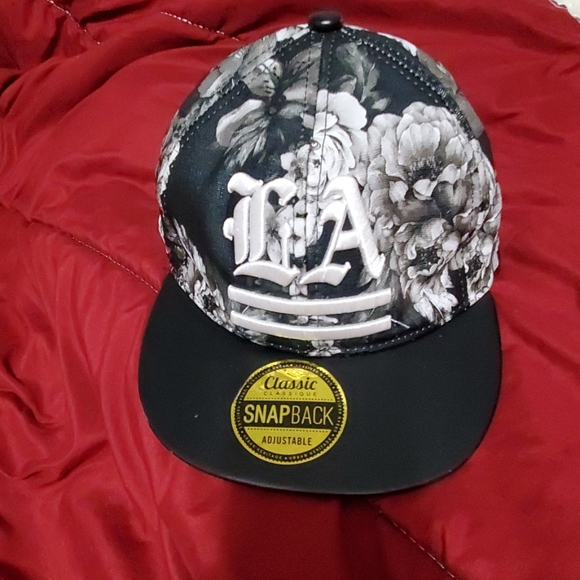Classic snapback hat, with a black and white floral print and an LA logo on the front.