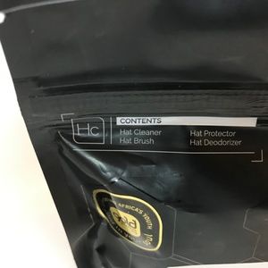 Comes in resealable travel pouch and includes: hat cleaner, hat protector, hat deodorizer and premium brush