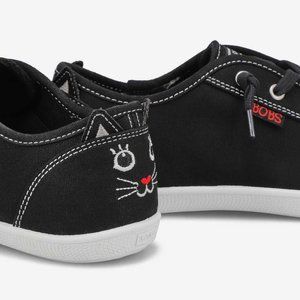 This casual design features a soft canvas upper with embroidered cat face and pop-out cat ear detail at the heel, plus a cushioned Skechers Memory Foam comfort insole. BOBS from Skechers logo detail. Flexible traction outsole.