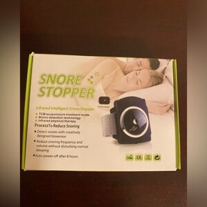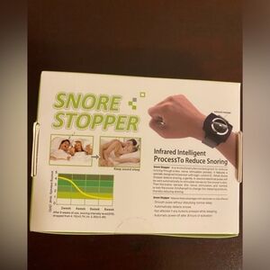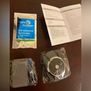 Snore Stopper device with self-adhesive electrodes and manual. Black and silver design.