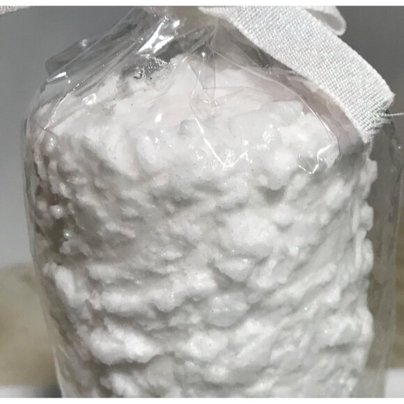 This candle boasts a unique snow texture and a subtle glitter finish, making it an elegant decorative piece. Ideal for creating a serene ambiance, it comes wrapped in a clear plastic with a white ribbon bow.