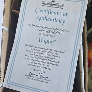 Delight in the holiday spirit with these charming "Snow White, sneezy, happy, and bashful at Christmas" porcelain dolls, created by The Ashton-Drake Galleries. The doll's are an original first issue production and come complete with their certificate of authenticity and original packaging (which has been opened).