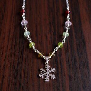 This pretty snowflake necklace makes an ideal gift this holiday season. In the center is a beautifully detailed snowflake pendant. This solid sterling silver pendant is about 13 x 20mm. A series of gemstones decorates the chain on either side, and includes garnet, morganite, prehnite, grossular garnet and honey quartz. I chose colours that represent an old-fashioned Christmas. Bright, sterling silver cable chain completes the necklace, and the clasp is accented with tiny peridot stones. This is a necklace that she will wear for years to come!