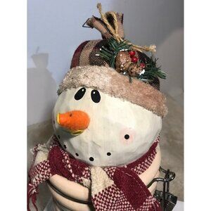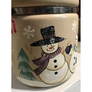 Snowman Cookie Jar Cannister Ceramic Hinged Fabric Hat & Scarf 11" Tall