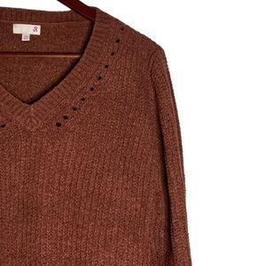 Features: Women's, oversized sweater, reddish brown, knit, long sleeve, ribbed split high low hi lo hem, ribbed cuffs, ribbed v neckline, eyelet detail near neckline, soft chenille feel, winter, warm, cozy, neutral