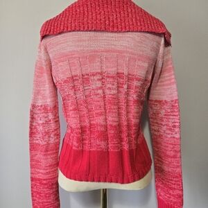 Adorable Y2K pink fitted cable knit sweater with a ribbed back collar and cuffs. Deepening shades of pink and a front button closure.