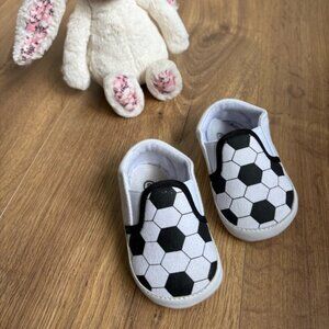 These stylish slip-on shoes feature a fun soccer pattern, perfect for active kids. The black and white design adds a sporty touch to any outfit. Like new. Open to offers.