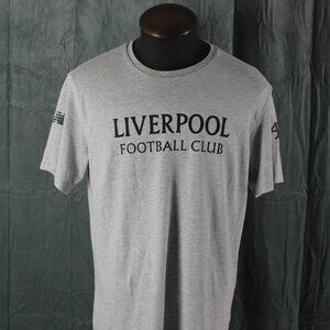 Up for sale is a retro soccer shirt by New Balance. It has a grey base colour with Liverpool Football Club screened across the chest in black. One sleeve has the New Balance logo screened on, while the other has a team sponsor AXA logo. What a great shirt do not miss out on it.