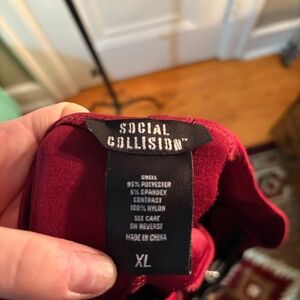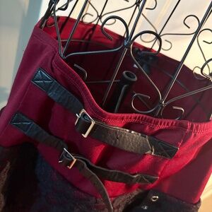Social Collision layered gothic skirt in deep red with black lace overlay. Features faux leather buckle straps, side lace-up detail, and tiered ruffle design. Size XL. Perfect for gothic, punk, steampunk, cosplay, or alternative fashion.