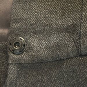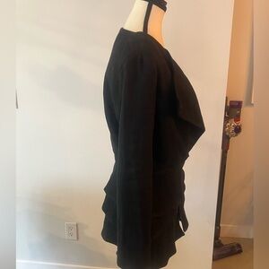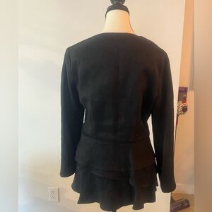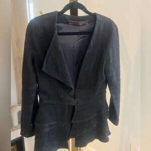 This gorgeous linen blazer has adorable ruffle features, a belt closure with an extremely feminine silhouette. In excellent condition!