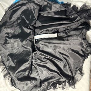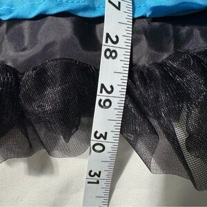 Get ready to twist and shout in this adorable sock hop poodle skirt costume! This one-piece retro outfit features a polka dot top with bright blue trim, a classic poodle applique on the skirt, and a fun black tulle fringe hem for extra swing and volume.