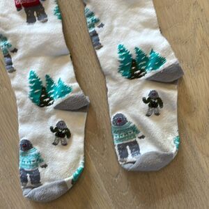 Gently worn socks. Yetis were first spotted in the snowy mountains of the Himalayas, but this family of furry beasts ended up on Mt. Hood. We're not quite sure how that happened, but we've heard on NPR that Yetis can travel through different dimensions. These guys clearly made a stop at the mall on their way--check out those sweaters! These funky knee-high socks will be a perfect addition to your Ugly Christmas Sweater Party. Feet are often left out of the holiday fun, but not anymore.