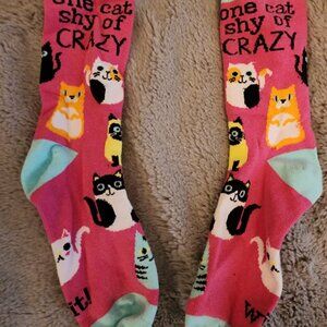 One Cat Shy of Crazy funny socks - never worn. Pink and turquoise with cats throughout the sock