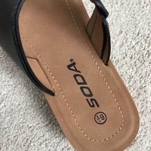 Brand new WOT Soda Brand black 2 strap sandals Open toe, slip on, all man made material 1” platform Size 6.5