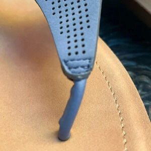 NWOT. Synthetic manmade material. Blue perforated upper piece. Tan coloured sole. Lightweight.