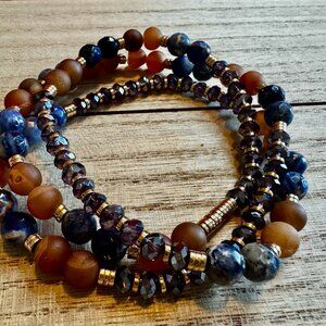 Turn heads with this stunning handcrafted wrap bracelet, featuring a rich mix of sodalite, druzy agate, and navy blue faceted crystal beads, all accented with radiant gold hematite spacers. This triple-wrap stretch design gives you the look of stacked bracelets in one effortless, easy-to-wear piece.