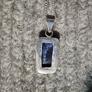 Lovely, dark blue sodalite, gemstone rectangle, pendant necklace jewelry/jewellery, ~1.25 inch stone cabochon, silver plate on a silver plated chain, unisex. Photos taken in shadow and under overhead light.