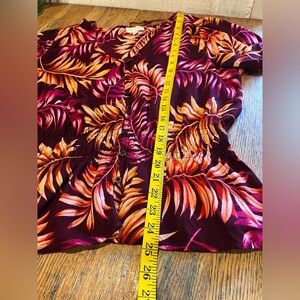Vibrant burgundy blouse with tropical leaf print in shades of orange, yellow, and pink. Lightweight and flowy, with a flattering V-neckline, gathered waist, and elasticated cuffs. Perfect for a colorful and relaxed outfit.