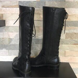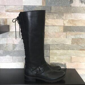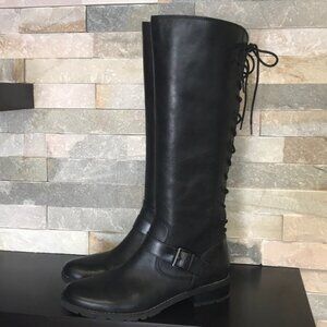 Smooth leather construction and a lace-up heel detail on a tall boot adds a little edge to your outfits.