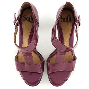Excellent pre-owned condition, Sofft patent leather purple T strap style open toe shoes with adjustable side strap and buckle for best fit, size 6.5M.
