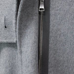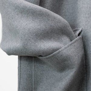 A long light grey hooded coat from Sofie D’Hoore featuring a hood with a high button-up collar, a concealed zipper closure, kimono sleeves, splits on the sides, and a pair of deep front flap pockets.