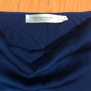 This silky soft navy blue blouse is perfect to fit under a blazer or cardigan because it is sleeveless and the neckline swoops down in the front.
