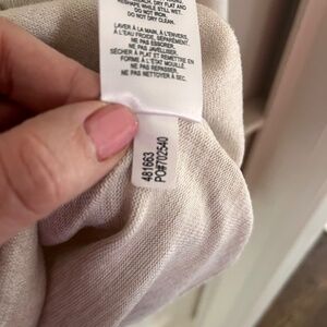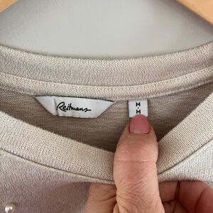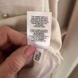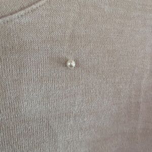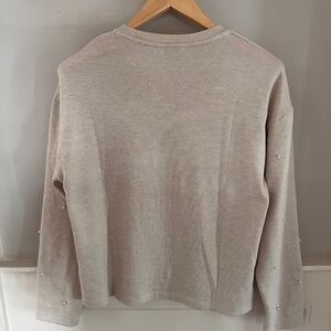 A cream-colored, long-sleeved knit sweater adorned with faux pearl embellishments. .